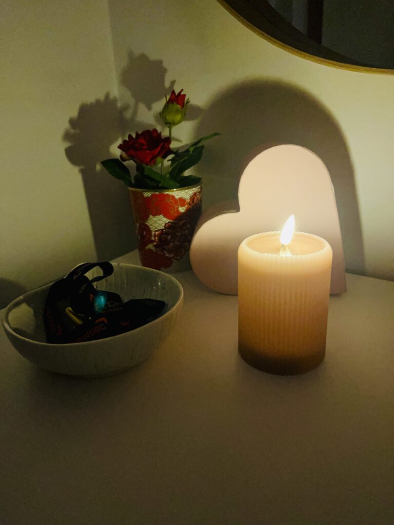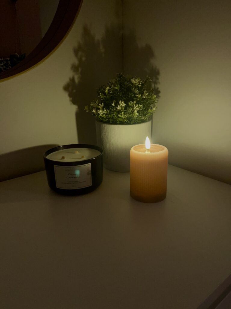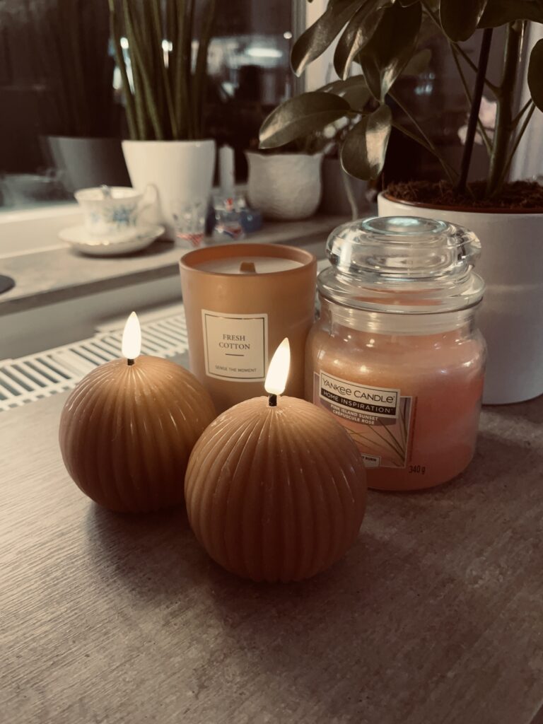 Ljuskällor som är dämpande såsom ljus är det bästa som lyser upp höstmörkret. Jag föredrar dock levande ljus men det kan jag tyvärr inte tända själv, men elektriska ljus är också mysigt. Men nu när jag har min kära kan vi ha levande ljus vilket är så mysigt.