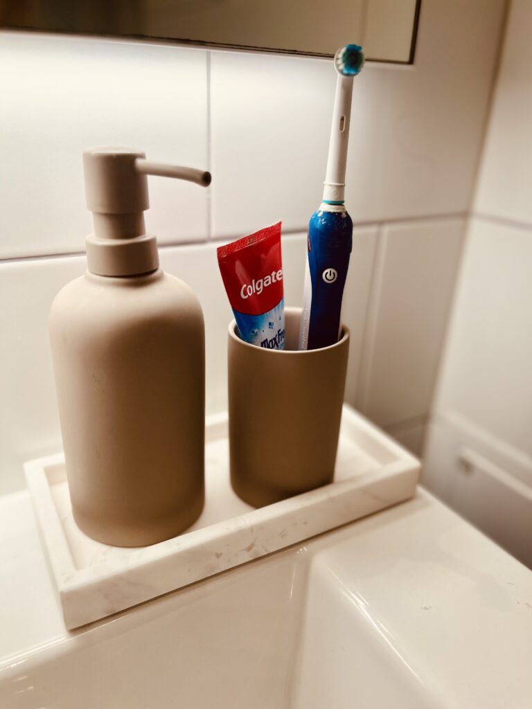 Nytt lyxigt sett på toan, marmorbricka, snygg tvålpump och tandbortshållare.