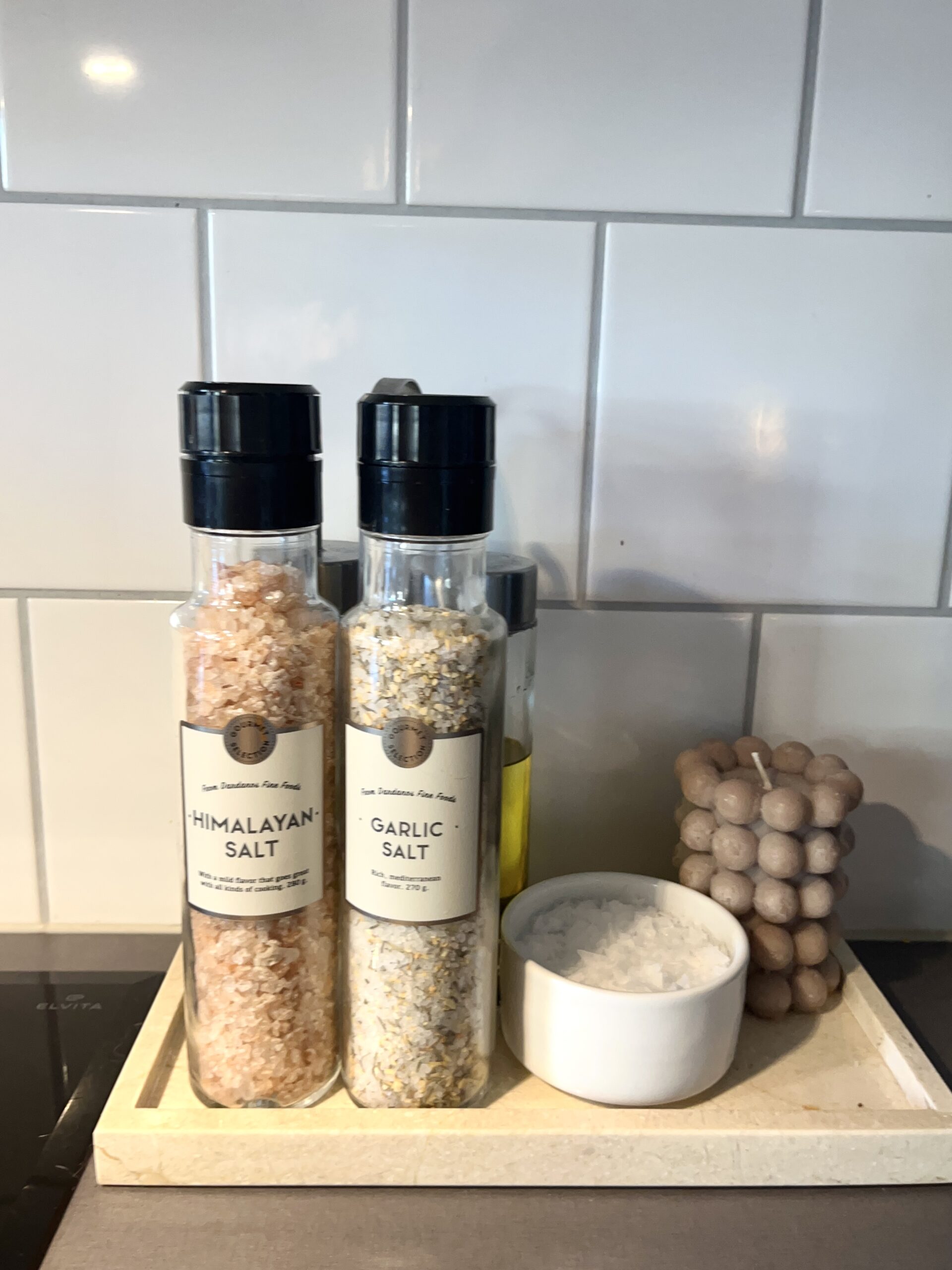 Jag köpte även denna tjusiga bricka och dessa två saltkar som jag har i köket. Jag blev så nöjd och tyckte att det blev en snygg detalj i köket, speciellt med ljuset på som blev ännu en snygg detalj.