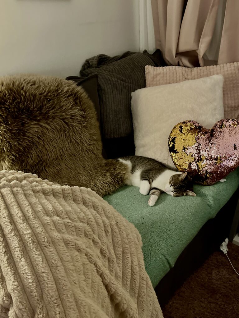 Allt ska höstmysas till, så även soffan med mycket filtar och kuddar. Frasse verkar också trivas och tycker att det är mysigt.