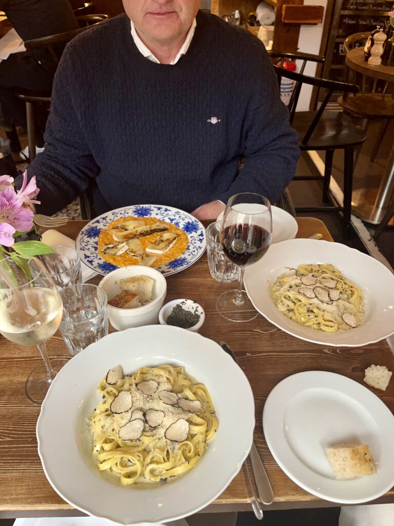 Efter bara 20 minuter typ i stugan kom grabbarna hem, glada och lyckliga efter en härlig stund i backen. Resten av eftermiddagen chillade vi, Arvid duschade, jag la mig och vilade lite för jag var lite trött, vi pratade med hans familj och bara myste. På kvällen blev det trerätters middag och vin! Superlyxigt! Jag trodde aldrig att jag skulle bli hungrig igen efter den varma chokladen, men jag var hungrig typ hela tiden där uppe, hahaha!
